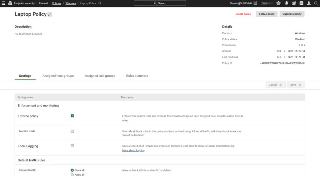 إدارة جدار الحماية من نوع فالكون قد تبسط تطبيق سياسات جدار الحماية على مستوى المضيف، مما يوفر رؤية مركزية وتحكم. مع وجود وحدة تحكم إدارية، يمكن للفرق الأمنية إنشاء وتعديل وتطبيق قواعد جدار الحماية عبر أجهزة ويندوز وماك.