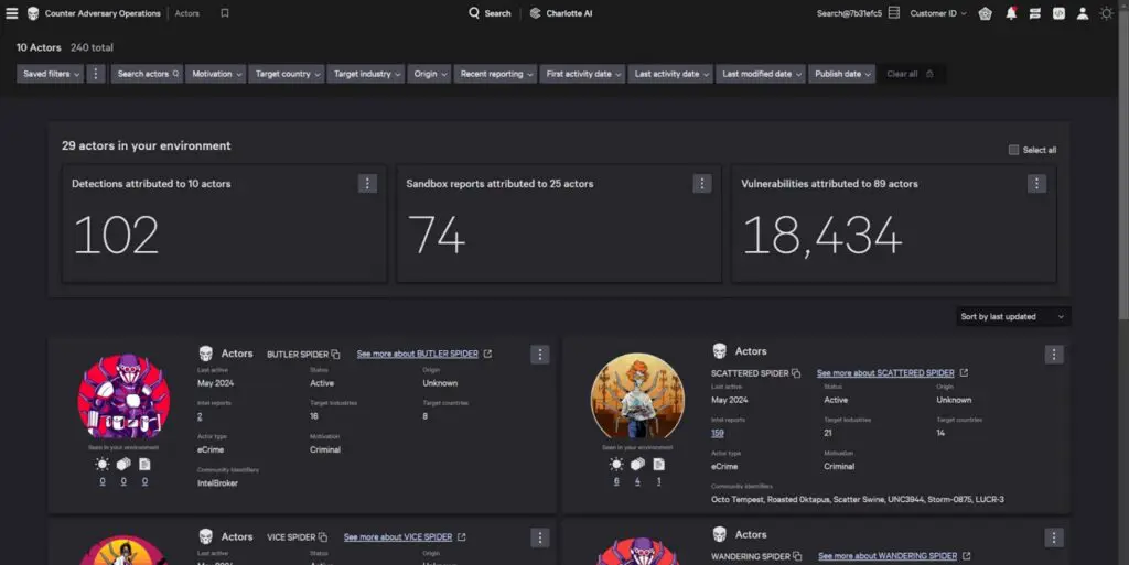 تقدم منصة Falcon Adversary Intelligence ملفات تعريف لأكثر من 245 مجموعة معادية. كما تحتوي المنصة على ميزات تحليل البرمجيات الضارة والتهديدات، بما في ذلك استخدام بيئات اختبار آلية للتحقيق السريع.
