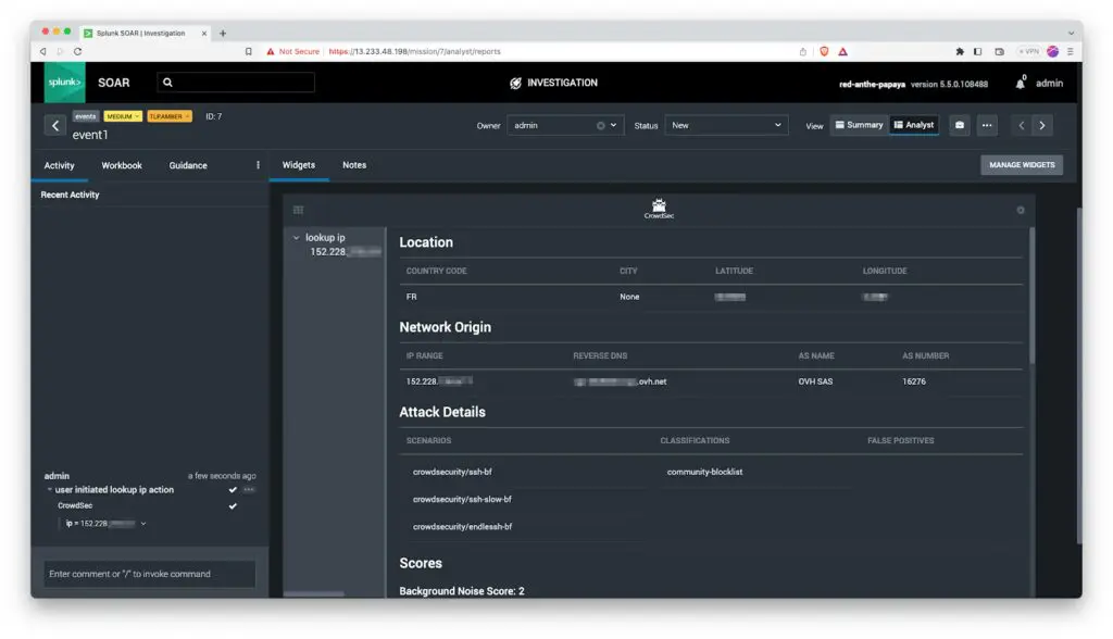 - الإجراء: الإجراء هو أمر عالي المستوى متاح ضمن Splunk SOAR، مثل حظر عنوان IP أو تعليق آلة افتراضية. يتم تفعيل الإجراءات إما يدويًا أو تلقائيًا من خلال كتب اللعب، وتوفرها التطبيقات المتصلة بالنظام.