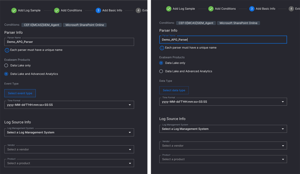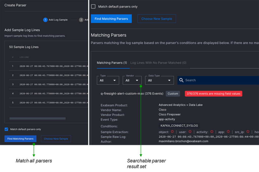 Unified Parser Creation Workflow integrates a single process for creating new parsers for Exabeam Data Lake, Advanced Analytics, or any other application benefiting from Exabeam augmentation. This makes it easy for your security analysts to quickly find the information they’re after instead of spending their time visually parsing through lines of dense event logs.